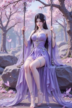 <lora:绚丽多彩·优化9:0.8>,lvjing,1girl,jewelry,feet,long hair,barefoot,solo,hair ornament,dress,flower,toes,sitting,swing,earrings,full body,anklet,purple dress,falling petals,rock,toenails,black hair,bare legs,legs,bracelet,outdoors,petals,detached sleeves,tree,bare shoulders,thighhighs,27,
