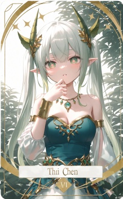 1girl, pointy ears, green eyes, solo, green hair, long hair, bare shoulders, parted lips, green dress, dress, jewelry, hair ornament, breasts, twintails, bracelet, looking at viewer, detached sleeves, upper body, large breasts, horns, strapless dress, leaf hair ornament, strapless, symbol-shaped pupils, orb, card (medium), hand up, sidelocks, necklace, tarot, blush