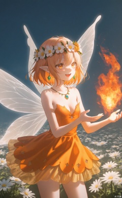 1girl, jewelry, fairy, solo, necklace, open mouth, orange eyes, breasts, pointy ears, wings, flower, fairy wings, orange dress, cleavage, dress, head wreath, earrings, short hair, fire, smile, bare shoulders, orange hair, strapless, small breasts, white flower, strapless dress, yellow eyes, teeth, hair flower, :d
