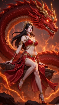 lvjing,1girl, dragon, long hair, black hair, high heels, red skirt, jewelry, embers, fire, skirt, teeth, sitting, earrings, breasts, thighlet, navel, midriff, hair ornament, solo, rock, full body, bare legs,71,