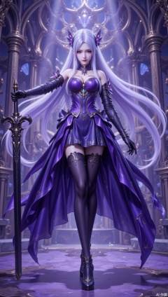 lvjing,1girl, weapon, sword, long hair, dress, thighhighs, purple dress, solo, holding weapon, gloves, hair ornament, holding sword, holding, black thighhighs, full body, breasts, purple eyes, looking at viewer, high heels, standing, black gloves, black footwear, parted lips, elbow gloves, bare shoulders, butterfly hair ornament, jewelry, off shoulder, indoors, very long hair, white hair, medium breasts,99,