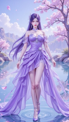 lvjing,1girl, purple dress, dress, solo, long hair, hair ornament, full body, jewelry, purple hair, sky, tree, bare legs, earrings, flower, water, high heels, bare shoulders, purple footwear, looking at viewer, breasts, purple eyes, anklet, cloud, outdoors, blue sky, falling petals, closed mouth, petals,116,