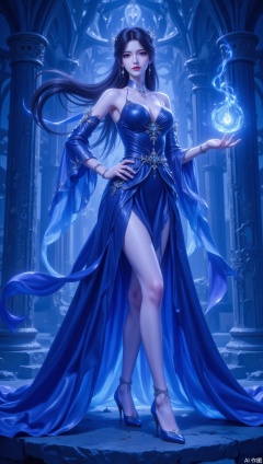 lvjing,1girl, dress, solo, long hair, breasts, blue dress, detached sleeves, jewelry, black hair, full body, high heels, earrings, anklet, magic, cleavage, standing, hand on own hip, hair ornament, pillar, bare legs, bare shoulders,132,