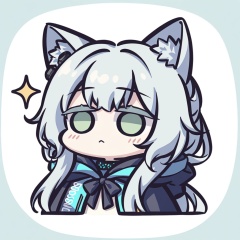 chibi,1girl,solo,upper body,rosmontis \(arknights\),arknights,animal ears,cat ears,long hair,green eyes,bangs,animal ear fluff,cat girl,white hair,grey hair,Blush, ,white background,simple background,<lora:Kei_Style_noob-4:1>,