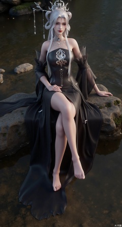 (masterpiece, best quality:1.2),,(UE5.5,rendered with Unreal Engine 5,Unreal Engine 5,CG rendering:1.1),.(huge breasts:2.69),full-body picture Composition from different angles A girl sitting on a stream stone solo Long hair Watching the audience Hair accessories Black dress. There is white embroidery on the skirt. White hair Earrings Necklace Show your legs Long legs Tall guy A faint smile eye shadow Red lips eyelash barefoot water Happy greeting to the camera Red lips There is a mark on the forehead forest. Moss grows all over the stones. clean water. Maple tree. fallen leaves. Leaves are floating on the water surface. The ground is covered with maple leaves. Realistic. Ultra clear. 8K. A masterpiece. Natural light..(huge breasts:2.99),(full breasts:2.99),Xzisehanfu,XluxueqiXY,Xyaoyue,Xyuyuanchuyu,Xsexhanfududou,XzhuxianxiaobaiX
