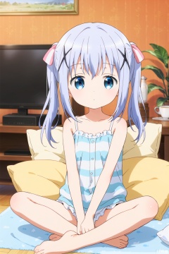 1girl,solo,long hair,looking at viewer,bangs,blue eyes,hair ornament,blue hair,hairclip,x hair ornament,light blue hair,,holding,sitting,barefoot,striped,indoors,hood,orange hair,cup,pillow,pajamas,mug,television,loungewear,striped hoodie,kafuu chino,hoto cocoa,,(loli:1.2),(slim:1.4),masterpiece,best quality,official art,extremely detailed CG unity 8k wallpaper,Hair accessories,single stripe ribbons,twintails,expressionless eyes,expressionless,Bare shoulders,camisole