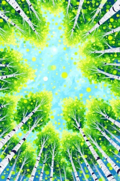 SK,This is a digital illustration depicting a vibrant, upward-looking view of a forest canopy. Tall, slender birch trees with white bark and black markings dominate the scene, surrounded by a dense array of green and yellow leaves. The background features a gradient sky transitioning from blue to light green, with scattered, overlapping circles adding a playful, abstract touch.