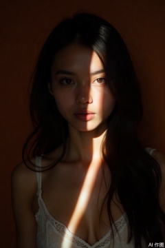 A person with long dark hair wears a delicate white lace top. Dramatic lighting casts shadows across their face, while a strong beam of light illuminates the left side, creating a striking contrast. The person's subtle expression shows their eyes looking directly at the camera. The background is a solid warm tone, possibly a wall, with no other objects or distractions. The composition emphasizes the interplay of light and shadow, enhancing the dramatic effect.