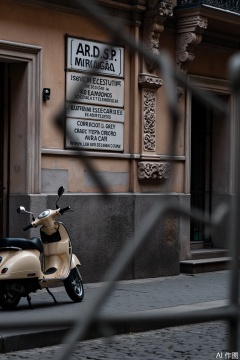 The image showcases a building with a sign prominently displaying "AR.D.S.P. MIRAGÃA" and "INSTITUTO DE ESTUDOS SOCIAIS E ECONOMICOS." The sign also features "CARREIO ELECTRICA E GELÊMIA E PROTEÇÃO E FISMAIS." In the foreground, a vintage scooter is parked on cobblestone pavement, and a fence partially obstructs the view. The urban setting highlights the building's historical or traditional architecture, with intricate stonework and ornate details. The scene is bathed in soft, natural daylight, enhancing the texture of the cobblestones and the rustic charm of the building.
