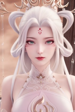 1girl, solo, long hair, looking at viewer, hair ornament, dress, bare shoulders, upper body, white hair, white dress, facial mark, hair rings, forehead mark, pink dress