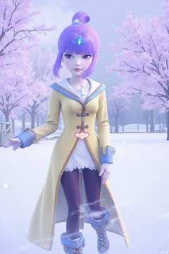 Quiet winter wonderland scene: a stunning beauty is standing, and her delicate purple hair cleverly outlines her face. Her charming posture shows her outstanding temperament. It complements the soft snowfall around her. In the distance, the blooming plum blossoms add a vibrant color to the quiet scenery, as if frozen in time.1 girl, solo, purple hair, pantyhose, boots, blunt bangs, black eyes, single bun, yellow skirt, long sleeves and headdress.