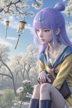Quiet fairyland scene: a stunning beauty is sitting, and her delicate purple hair cleverly outlines her face. She has a book in her hand. Her charming posture shows her outstanding temperament. It complements the soft sunshine around her. In the distance, plum blossoms in full bloom and wind chimes hanging on them add a touch of vitality to the quiet scenery, as if frozen in time.1 girl, solo, purple hair, pantyhose, boots, blunt bangs, black eyes, single bun, yellow skirt, long sleeves and headdress.