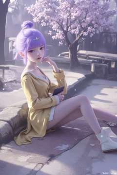 Quiet fairyland scene: a stunning beauty is sitting, and her delicate purple hair cleverly outlines her face. She has a book in her hand. Her charming posture shows her outstanding temperament. It complements the soft sunshine around her. In the distance, plum blossoms in full bloom and wind chimes hanging on them add a touch of vitality to the quiet scenery, as if frozen in time.1 girl, solo, purple hair, pantyhose, boots, blunt bangs, black eyes, single bun, yellow skirt, long sleeves and headdress.Close-up of the upper body