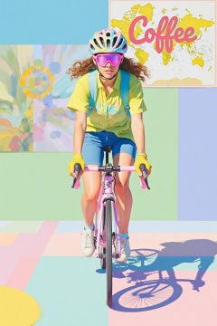 beijihui,a woman is riding a pink bicycle with a helmet and goggles on her head. She is wearing a yellow shirt, blue shorts, and white sneakers. Her hands are covered with yellow gloves. Her helmet is adorned with a colorful design. Her goggles are pink, adding a pop of color to her outfit. The background is a collage of pastel colors, including blue, green, pink, and purple. To the right of the bicycle is a map of the world, with the word "Coffee" written in bold red letters.