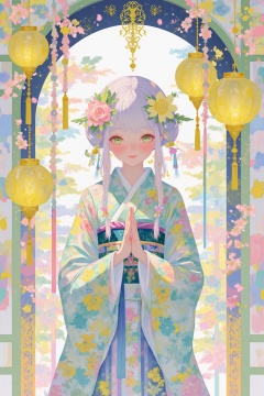 beijihui,Captured in a digital art style, a kimono-style doll stands with her hands clasped in front of her. The doll's head is adorned with a wreath of flowers, adding a touch of beauty to the scene. The background is a mix of pastel colors, including yellow, pink, blue, and green, creating a vibrant contrast to the doll's outfit. There are a few decorative lanterns hanging from the ceiling, adding depth to the composition.