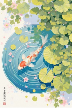 beijihui,An eye-level painting of a goldfish swimming in a pond. The goldfish is facing the left side of the frame, its long tail trailing behind it. The background of the painting is a light blue, with a pattern of green leaves and pink flowers scattered throughout it. To the right of the goldfish, there is a large green leaf floating on the surface of the pond.