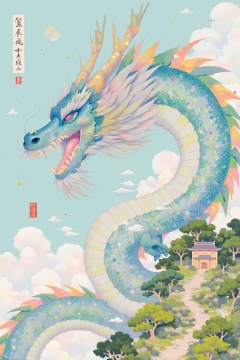 beijihui,An eye-level painting of a dragon, its head facing towards the left side of the frame. Its mouth is open, revealing its sharp teeth. The dragon's head is adorned with a variety of colors, including blue, green, pink, and orange. The background is a light blue, with a few white clouds scattered across it. There are a few trees in the bottom right corner of the painting, their leaves are a mix of green and pink. There is a small brown building in the upper right corner.
