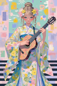 beijihui,An abstract painting of a woman in a kimono, holding a guitar in her hands. The woman's dress is adorned with flowers in a variety of colors, including pink, yellow, green, blue, and purple. Her hair is tied up in a bun, and she has a wreath on her head. Her eyes are a piercing blue. The background is a mix of pink, purple, and green, and there are black lines running across the bottom of the frame.