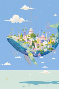 beijihui,Captured at eye-level, a painting of a whale, soaring through the air, its tail trailing trailing behind it. The whale's tail is adorned with a vibrant array of colors, including blue, green, yellow, pink, and purple. The sky is a deep blue, dotted with white clouds, adding a pop of color to the scene. The water beneath the whale is a light blue, creating a stark contrast to the blue sky.