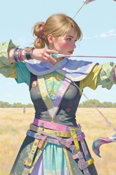 beijihui,a digital painting of a woman dressed in a colorful outfit,holding a bow and arrow in her hands. The woman's hair is styled in a ponytail,adding a pop of color to the scene. The backdrop,a grassy field stretches out to the right of the woman. The sky is a muted blue,with a few wispy clouds in the distance.,