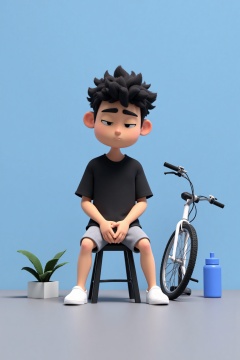 beijihui,a 3D rendering of a man in a black t-shirt and gray shorts is sitting on a black stool. The man's arms are crossed in front of him, with his hands resting on his knees. His head is tilted slightly to the right, and his eyes are squinted. His hair is short and dark, and he's wearing a pair of white shoes. To the right of the man, a white bicycle is parked, its front tire is visible. A blue water bottle is placed on the ground, and a small green plant is placed in a white box. The backdrop is a light blue, and the floor is a solid gray.