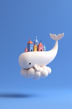 beijihui,Captured at eye-level on a vibrant blue backdrop,a 3D rendering of a white porcelain whale is soaring in the air. The whale's body is angled towards the right side of the frame,while its tail is pointed towards the left side. A small black dot is positioned at the top of the whale's head,adding a pop of color to the scene. A row of houses,each with their own own unique design,are situated on top of a fluffy white cloud. The houses are arranged in a row,with a variety of colors including pink,blue,yellow,and orange. The clouds are floating on the ground below the whale,creating a sense of depth and composition.,