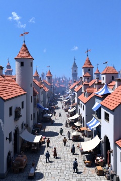 beijihui,a cobblestone square is seen against a bright blue sky dotted with a few white clouds. The square is adorned with a variety of colorful buildings,each with a unique red roof and white walls. The buildings are adorned with white and blue tents,adding a pop of color to the scene. A few people are walking through the square,seemingly unaffected by the presence of a medieval castle in the background.,