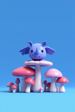 beijihui,Captured at eye-level on a vibrant blue backdrop, a blue toy rhino stands atop a row of pink and white mushrooms. The rhino's head is adorned with two black eyes, a black nose, and two small black eyes. Its wings are spread out, adding a touch of balance to the scene. The mushrooms are arranged in a way that creates a stark contrast to the blue backdrop. The mushroom on the left side of the image is a bright pink, while the one on the right side is a lighter pink.
