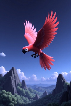 beijihui,a vibrant red parrot is soaring through the air,its wings spread wide,revealing a vibrant shade of pink. The parrot's head is adorned with a black beak,adding a pop of color to the scene. The backdrop of the parrot,a backdrop of mountains,is a deep blue,with a few wispy clouds in the sky.,