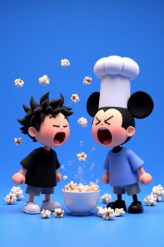beijihui,Captured on a vibrant blue backdrop,two cartoon characters are standing in front of a white bowl. The character on the left is wearing a black short sleeve shirt,gray shorts,and white shoes. The person on the right is a Mickey Mouse character,wearing a white chef's hat and a blue shirt. His mouth is open,as if he is screaming. His ears are pointed up,and his eyes are closed. The background is a deep blue,and there are white popcorn bubbles floating in the air.,