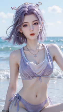 hair ornament, 1girl, solo, looking at viewer, smile, short hair, purple hair, navel, jewelry, sitting, swimsuit, bikini, earrings, outdoors, sky, day, cloud, water, necklace, bracelet, blue sky, lips, ocean, realistic,photo taken with a Canon EOS R6 Mark II Mirrorless camera in the style of 35mm f/8 aperture, intricate details.dlrb,hsw,forehead mark,qfl, XLDMHF,large natural breast,soft breasts,huge Breasts,cleavage posing for the magazine cover, professional photography with studio lighting,photo taken with a Canon EOS R6 Mark II Mirrorless camera in the style of 35mm f/8 aperture, intricate details.dlrb,hsw,hkgod,mohuan,large natural breast,soft breasts,huge Breasts,cleavage,ddw