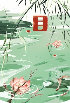 JQCH, A serene, minimalist digital illustration of a pond with a single lotus flower in bloom. The water is calm, with gentle ripples and reflections. The pond is surrounded by lush, green foliage, and a few willow branches hang down. The background is a soft, muted green, with a subtle, textured pattern. In the top right corner, there is a traditional Chinese character in red, and a small, red square below it. The overall color palette is soft and soothing, with a focus on natural elements.