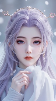 This is a highly detailed digital artwork in a realistic anime style. The subject is a young woman with pale, flawless skin and large, expressive blue eyes. She has long, silky, light purple hair adorned with small pink and white flowers. She wears a soft, pastel pink turtleneck sweater and holds a white, fluffy garment close to her face. The background is blurred with soft, cool colors, suggesting an outdoor, winter-like setting. Her expression is gentle and slightly melancholic. The lighting is soft, highlighting her delicate features and creating a serene, ethereal atmosphere. The overall composition is delicate and dreamlike.