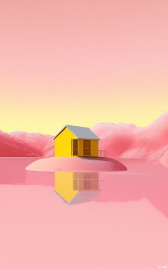 FWG, A surreal, digital artwork featuring a two-story yellow house with a grey roof and white trim, situated in a vast, pink landscape. The house is surrounded by a reflective, pink water body, mirroring the sky. The background showcases a gradient sky transitioning from yellow to pink, with distant, pink mountains. The scene is bathed in warm, soft lighting, creating a dreamlike, peaceful atmosphere. The style is reminiscent of surrealist or fantasy art, with a playful, whimsical tone. The house is centered in the composition, with the water body extending outwards.