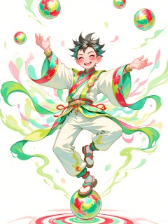 GFYQ, A celadon-glazed style digital illustration of a lively street performer with a mischievous grin. His hair is short and spiky, dyed in a mix of celadon and black. He wears a colorful costume with celadon accents, juggling three balls in his left hand while balancing on a ball with his right foot. The background is minimalistic, with soft celadon and bright red hues, showing a bustling street scene. The style is reminiscent of Chinese folk art illustrations with a celadon glaze, featuring dynamic lines and a festive, energetic atmosphere. The street performer has a cheerful and energetic expression, and the overall composition exudes fun and excitement.