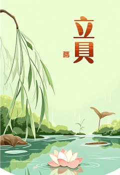JQCH, A serene, minimalist digital illustration of a pond with a single lotus flower in bloom. The water is calm, with gentle ripples and reflections. The pond is surrounded by lush, green foliage, and a few willow branches hang down. The background is a soft, muted green, with a subtle, textured pattern. In the top right corner, there is a traditional Chinese character in red, and a small, red square below it. The overall color palette is soft and soothing, with a focus on natural elements.