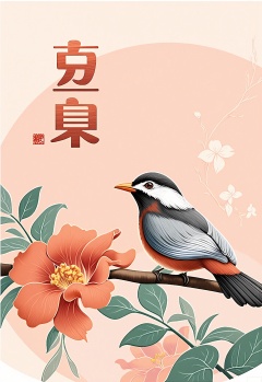 JQCH, A digital illustration in a traditional Chinese style features a small bird with a grey and white head, red and black body, perched on a branch of a blooming flower. The background has a soft peach color with a large, semi-transparent circle. The bird is detailed with fine lines and shading, and the leaves and petals have a soft, textured appearance. The bird is facing right, with its beak open as if singing. The image has a serene and elegant feel.