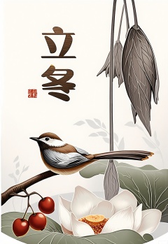 JQCH, A digital painting featuring a small bird perched on a branch, surrounded by autumnal foliage. The bird has brown and white feathers and is facing right. The background includes large, dried lotus flowers with intricate details and a few small red berries. The color palette is predominantly earthy tones with shades of brown, beige, and gray. The style is reminiscent of traditional East Asian art, with delicate brushstrokes and a serene, tranquil atmosphere. The artist's signature is visible in the upper right corner, and the text "平安" (meaning "peace" in Japanese) is written vertically on the right side.