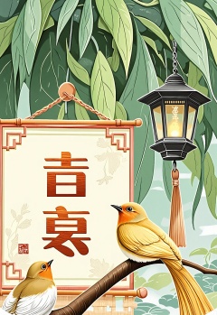 JQCH, A digital illustration featuring two small, yellow birds perched on a traditional Japanese shoji screen. The birds have delicate wings and are looking upwards. The screen is decorated with intricate patterns and a red and white Japanese character. Hanging from the top right corner is a traditional Japanese lantern. The background is filled with lush green foliage and vines, adding a serene and natural feel to the scene. The style is reminiscent of traditional Japanese art, with soft colors and delicate lines.