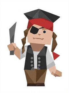 LPFG, Cartoon-style drawing of a pirate with a pentagon-shaped head, wearing a tricorn hat, a red bandana, and a black eye patch. He stands confidently on the deck of a ship, holding a cutlass in his left hand and pointing with his right hand at the horizon. The ship's mast and sails are visible in the background, but the overall setting is a plain white space to focus on the pirate. The pirate's expression is fierce and adventurous. The style is simple and blocky, reminiscent of low-poly art.