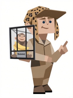LPFG, Cartoon-style drawing of a zookeeper with an animal-print-shaped head (like a leopard), wearing a khaki uniform and a hat. He stands confidently behind a cage, holding a bunch of bananas in his left hand and pointing with his right hand at a monkey inside. The cage has a sign with the animal's name. The background is plain white. The zookeeper's expression is friendly and knowledgeable. The style is simple and blocky, reminiscent of low-poly art.