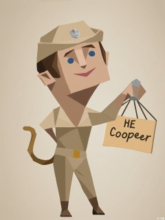 LPFG, Cartoon-style drawing of a zookeeper with an animal-print-shaped head (like a leopard), wearing a khaki uniform and a hat. He stands confidently behind a cage, holding a bunch of bananas in his left hand and pointing with his right hand at a monkey inside. The cage has a sign with the animal's name. The background is plain white. The zookeeper's expression is friendly and knowledgeable. The style is simple and blocky, reminiscent of low-poly art.