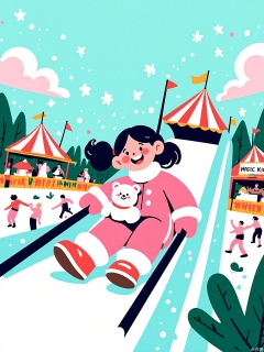 SLXT, A dynamic, vector-lined commercial illustration of a winter wonderland carnival. A little girl in a fluffy pink snowsuit and matching mittens is zooming down an icy slide. She has a big smile on her face and is holding onto a stuffed polar bear. The background shows a snowy carnival with an ice skating rink, a hot cocoa stand, and a sign reading "Winter Magic." The sky is a soft powder blue with delicate snowflakes falling. The style is whimsical and cartoonish, with bold outlines and bright, icy colors, evoking the joy and wonder of a winter carnival.