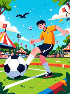 SLXT, A colorful, vector-lined commercial illustration of a sports-themed carnival. A young boy in a soccer jersey is kicking a ball into a goal on a soccer-themed carousel. The background depicts a sports carnival with a basketball shooting game, a hot dog stand with sports-themed toppings, and a sign that says "Sports Spectacle." The sky is a bright blue with a few white clouds. The style is energetic and cartoonish, with bold outlines and a mix of bright team colors, capturing the excitement and competition of a sports carnival.