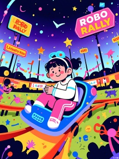 SLXT, A vibrant, vector-lined commercial illustration of a robot-themed carnival. A little girl in a futuristic outfit is riding a robot-shaped roller coaster. She holds a glowing toy. The background features a high-tech carnival with a laser tag arena, a robotic arm candy grabber, and a sign reading "Robo Rally." The sky is a dark purple with some neon lights. The style is energetic and cartoonish, with bold outlines and a mix of bright, futuristic colors, conveying the thrill and wonder of a robot carnival.
