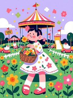 SLXT, A colorful, vector-lined commercial illustration of a flower-themed carnival. A little girl in a floral dress is picking flowers on a flower-shaped carousel. She holds a basket of flowers. The background depicts a blooming carnival with a sunflower slide, a rose-flavored cotton candy stand, and a sign reading "Floral Fiesta." The sky is a soft lavender with some fluffy white clouds. The style is whimsical and cartoonish, with bold outlines and bright, floral colors, evoking the beauty and joy of a flower carnival.
