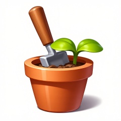XTB, A digital illustration of a cartoon game icon of a gardening shovel attached to a brown flower pot-shaped clip-on holder, against a white backdrop. The gardening shovel has a wooden handle and a metal blade. The design is gardening and nature-inspired, with a planting aesthetic. The shovel is slightly buried in the soil of the flower pot, as if the gardener is about to dig. The flower pot-shaped clip has soil and a small plant growing out of it, adding realism. The overall style is clean and modern, highlighting the joy of gardening.