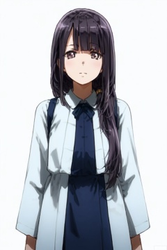looking at viewer,mori fumika, 1girl, solo, long hair, brown eyes, bangs, blunt bangs, black hair, purple eyes, hair over shoulder,Mori Fumika