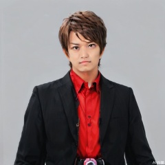 looking at viewer,dcd,1boy,male focus,brown hair,shirt,realistic,jacket,suit,camera,belt,brown eyes,red shirt