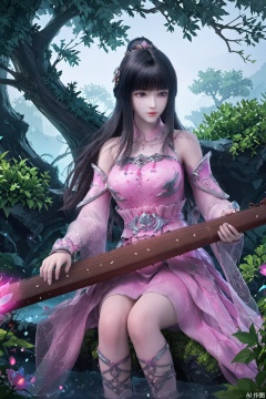 score_9_up , LinShuiYao,1girl, solo, long hair, black hair, dress, sitting, flower, detached sleeves, water, tree, instrument, pink dress, playing instrument,armor dress